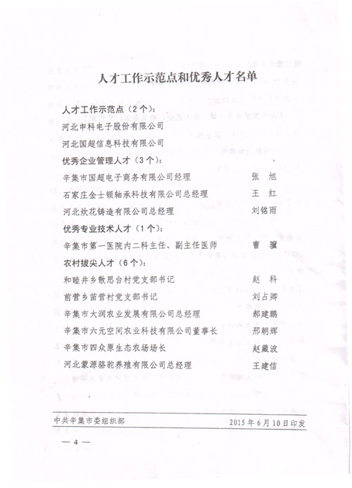2015年6月10日,我公司被中共辛集市委組織部確定為“人才工作示范點”,公司子公司----辛集市國超電子商務有限公司總經理張旭被評為“優(yōu)秀企業(yè)管理人才”。