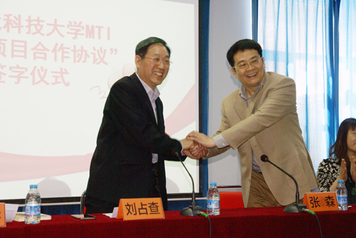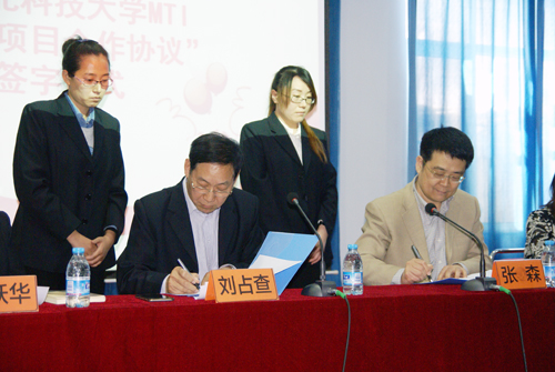 | 2016年4月21日下午,河北科技大學(xué)外國語學(xué)院院長張森攜有關(guān)領(lǐng)導(dǎo)及師生30多人、我公司董事長劉占查攜全體員工共計100余人,在公司多功能廳,就建立河北科技大學(xué)翻譯碩士研究生工作站項目成功簽約。會上,我公司董事長劉占查發(fā)表了熱情洋溢的歡迎詞,對校方多年的鼎力支持表示感謝;河北科技大學(xué)外國語學(xué)院院長張森就“建站”意義及校企雙方廣泛深度合作問題做了重要講話。 河北科技大學(xué)外國語學(xué)院副院長崔麗、河北科技大學(xué)外國語學(xué)院研究生教研室主任霍月紅、河北科技大學(xué)外國語學(xué)院成教與培訓(xùn)辦公室主任杜之濤、河北科技大學(xué)外國語學(xué)院翻譯系教師秦永生、河北科技大學(xué)外國語學(xué)院翻譯系教師閆亞琳,我公司工會主席、綜合事業(yè)部主任尚躍華、編譯部主任強紅心出席了簽約儀式。