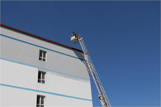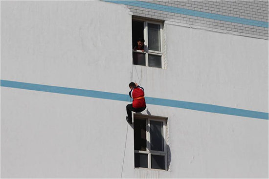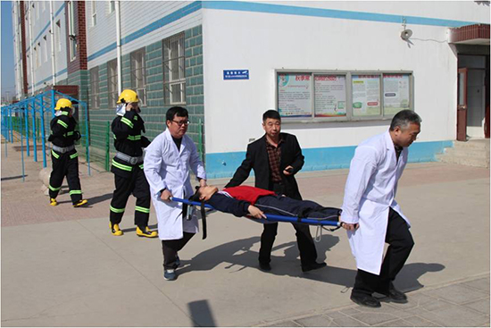 本次活動假想新壘頭鎮(zhèn)中學(xué)學(xué)生宿舍樓三樓因線路設(shè)備老化發(fā)生火災(zāi),學(xué)生發(fā)現(xiàn)火情,迅速報告值班老師,值班老師到現(xiàn)場查看后通知值班室,然后迅速啟動消防應(yīng)急預(yù)案,組織學(xué)生進行緊急疏散。失火點位于三樓宿舍內(nèi),值班人員率先組織三樓學(xué)生進行疏散,之后四樓值班人員聽到廣播開始組織學(xué)生疏散,五樓、二樓、一樓的學(xué)生在老師組織下依次有序疏散。經(jīng)過3分25秒,全校1100多名師生有序疏散完畢,趕到指定地點集合。 學(xué)校消防員接到火災(zāi)通知后迅速穿戴消防戰(zhàn)斗服及防煙面具,攜帶滅火器沖入火場,處理初期火災(zāi)。因火勢太大,無法控制,通訊組匯報給校長,馮校長立刻撥打了119火災(zāi)報警電話。得知一名同學(xué)昏迷,學(xué)校醫(yī)護人員迅速趕到宿舍樓,用擔(dān)架抬出昏迷學(xué)生,120急救人員立即進行搶救。消防人員指導(dǎo)四樓被困學(xué)生用緩降器進行自救,并派遣云梯車對樓頂學(xué)生進行營救。