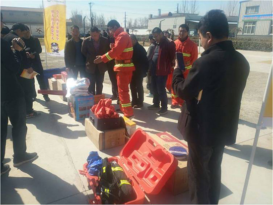 隨后河北國超消防設(shè)備科技有限公司提供消防器材展示,包含水基滅火器、25米鋼絲繩緩降器、自救呼吸器、應(yīng)急手電筒等設(shè)備,并由專業(yè)人員進行講解。
